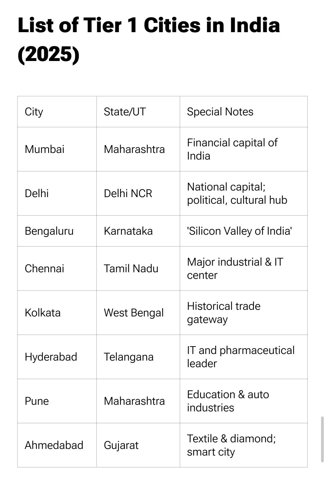Mumbai, Delhi and Bangalore are the biggest but the gap between them and the rest isn't as big as the one between the these 8 and other cities. Cities like Noida might even break into the tier 1 category (and Kolkata will probably fall out)