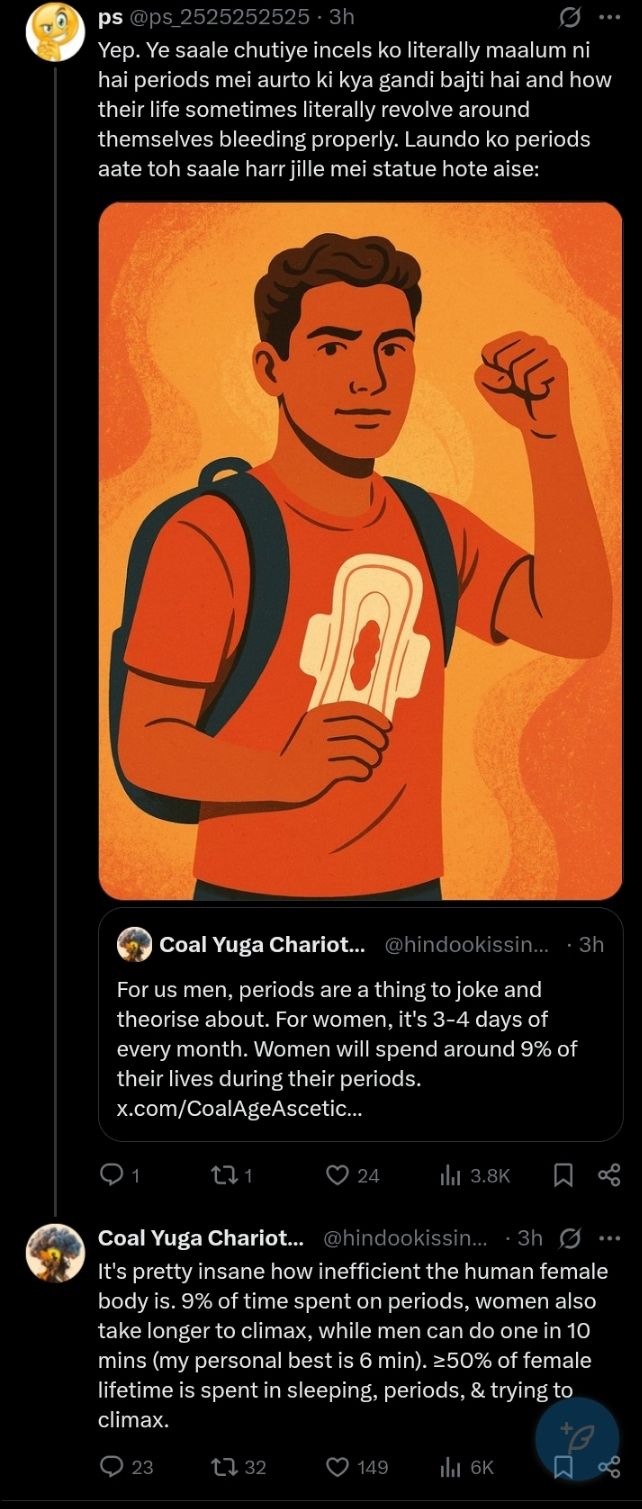 Chup incel dyaush, hindookissinger has said not to made light of women's troubles so we won't