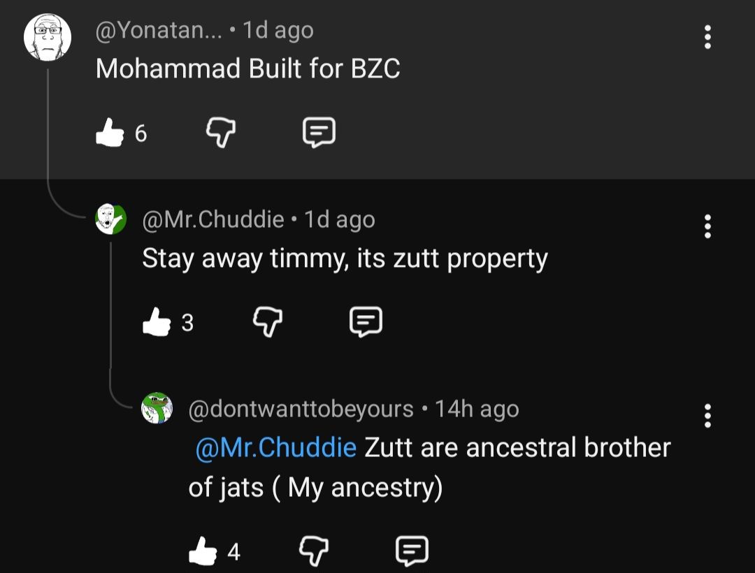 Reminds me of the kalu jaat meme, which is very funny considering the hadith define the men of Al Zutt as having brownish skin with BDL's.