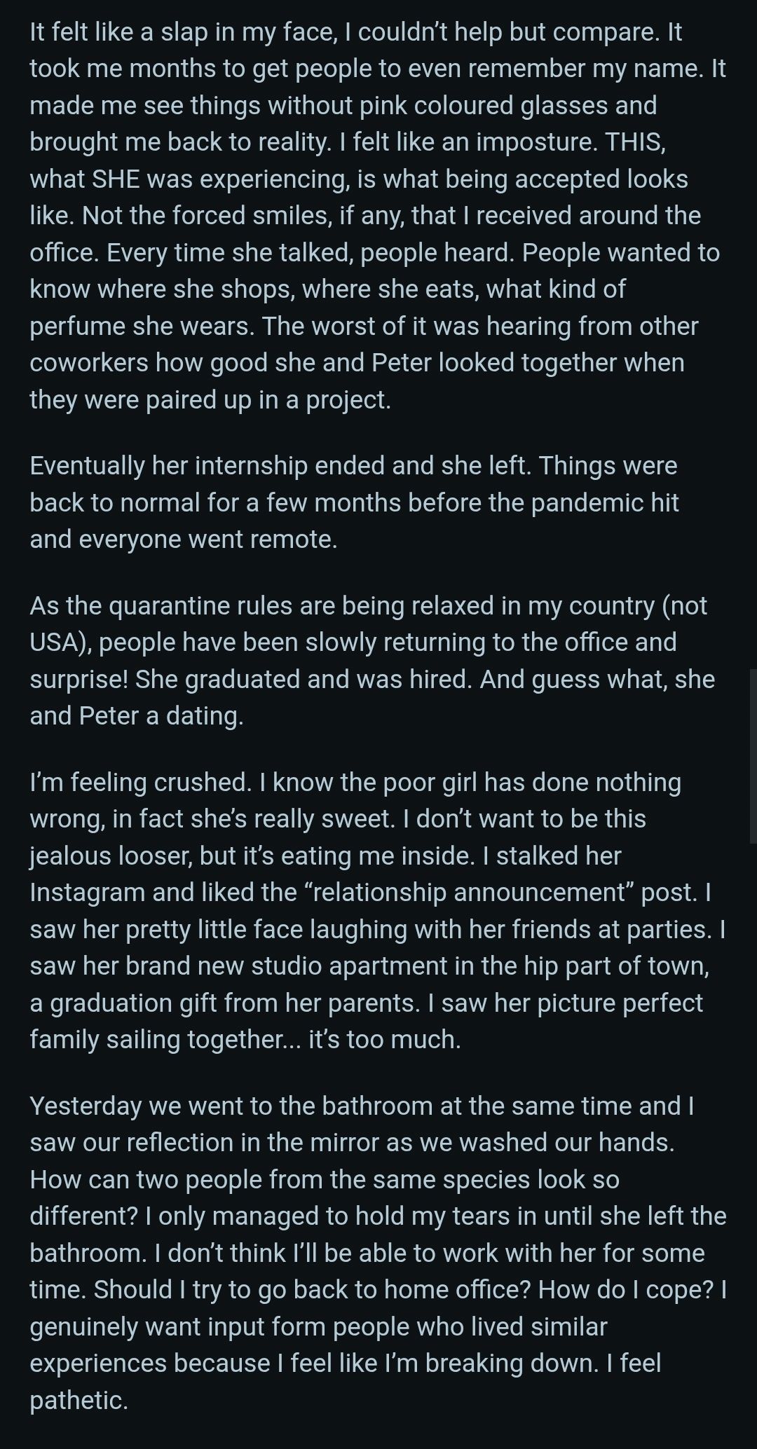 This one time I ordered some lunch for her and shared it with her during break, offering her chocolate cakes and what not and i could see the self proclaimed mid looking femcel get red eyes