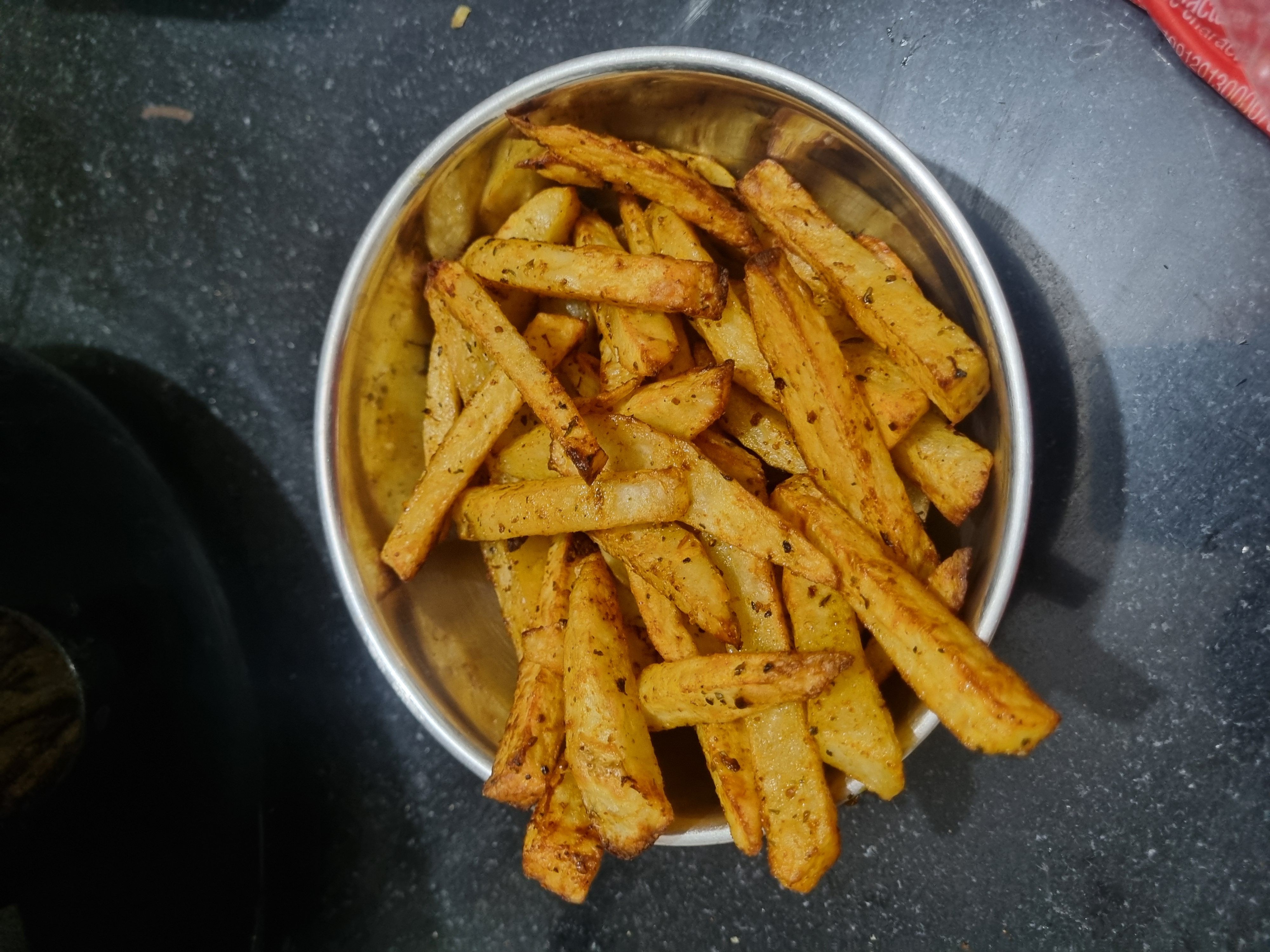 Had chicken salami sandwich for breakfast, 2 apples for lunch, french fries in the evening and fish for dinner. Good day today