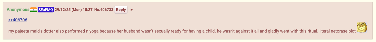 One anon commented about Niyoga still being practiced in 2025 yaara then I had to google what the process it is coom and kek worthy.