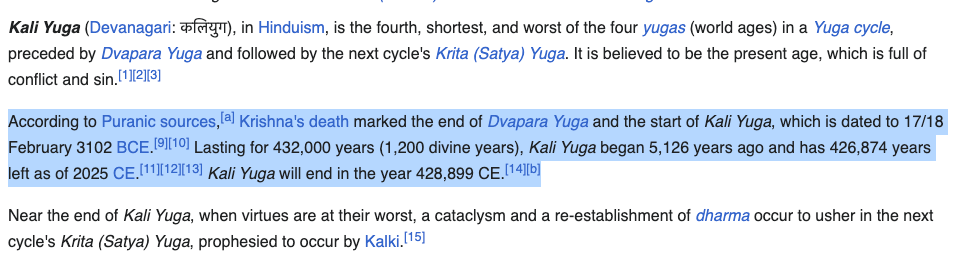 Kali Yuga began 5,126 years ago and has 426,874 years left as of 2025 CE. Kali Yuga will end in the year 428,899 CE.