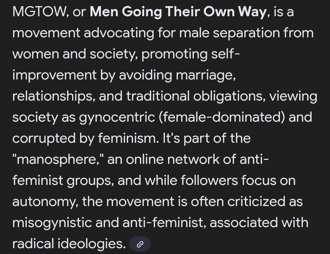 Makes you wonder, this has lasted for decades now. Why don't we see men making world better or anything? All you see is men whining about all these sub5 foids. It's actually detrimental to the entire purpose of movement. I used to think all of these MGTOW guys should workout, sleep well, and end financially excell after choosing to be Volcels.
