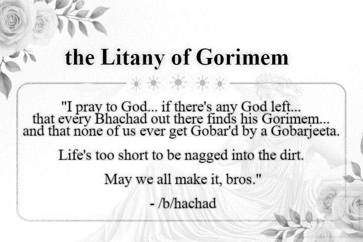 "I pray to God... if there's any God left... that every Bhachad out there finds his Gorimem... and that none of us ever get Gobar'd by a Gobarjeeta. Life's too short to be nagged into the dirt. May we all make it, bros."