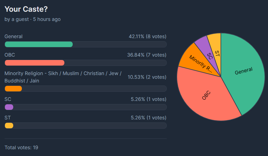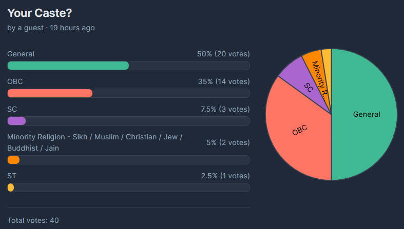 50% of the posters who voted are GC, 35% are OBC, 7.33% are SC, 5% are minority and 2.5% are ST.