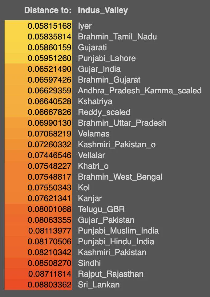 the ancestory of the indus is most closely related to the people of tamil nadu, people of south western coast of india, the gujratis and balochis.