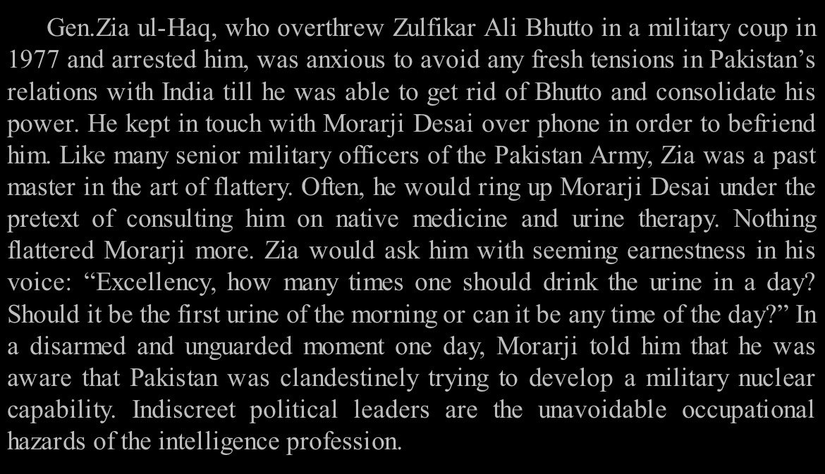 >Gen.Zia ul-Haq, who overthrew Zulfikar Ali Bhutto in a military coup in 1977 and arrested him, was anxious to avoid any fresh tensions in Pakistan's relations with India till he was able to get rid of Bhutto and consolidate his power. He kept in touch with Morarji Desai over phone in order to befriend him. Like many senior military officers of the Pakistan Army, Zia was a past master in the art of flattery. Often, he would ring up Morarji Desai under the pretext of consulting him on native medicine and urine therapy. Nothing flattered Morarji more. Zia would ask him with seeming earnestness in his voice: "Excellency, how many times one should drink the urine in a day? Should it be the first urine of the morning or can it be any time of the day?" In a disarmed and unguarded moment one day, Morarji told him that he was aware that Pakistan was clandestinely trying to develop a military nuclear capability. Indiscreet political leaders are the unavoidable occupational hazards of the intelligence profession.