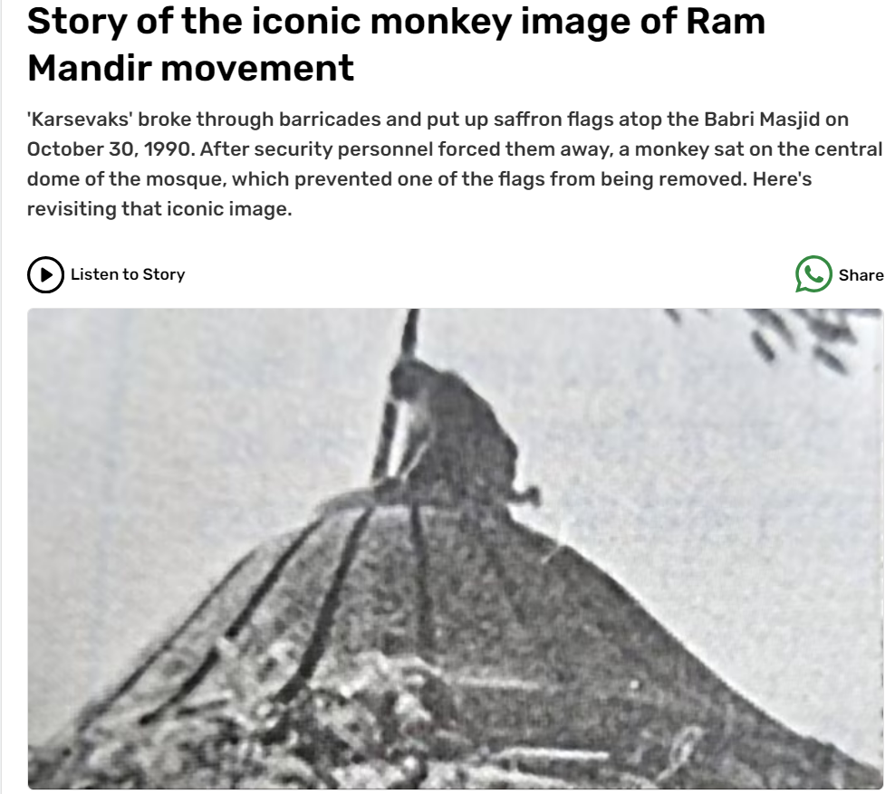 >In June 1998, a monkey is widely believed to have prevented a massive bomb blast at the Hanuman Garhi temple in Ayodhya, India, by tampering with wires connected to a bomb hidden by terrorists. The monkey reportedly disabled a 8-20 kg RDX explosive hidden in a water-cooling machine, which was intended for a significant blast