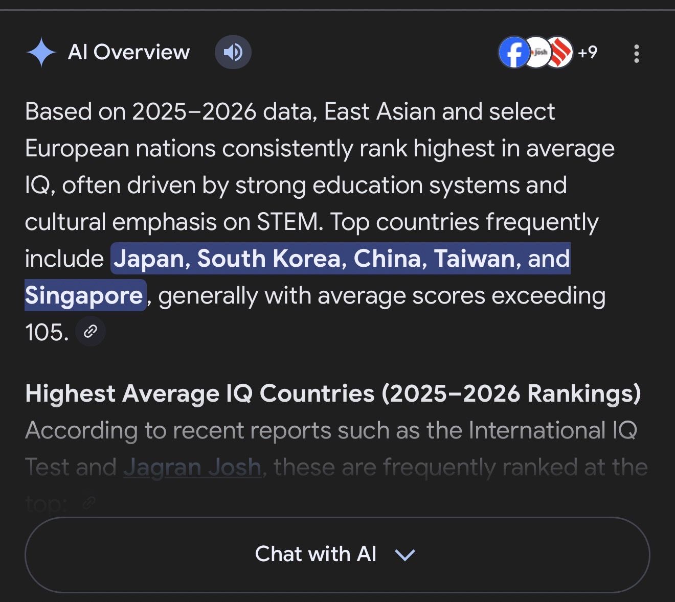 nope east asian countries have been dominating IQ rankings for a while now due to their widespread stoodycelling culture and math heavy education systems