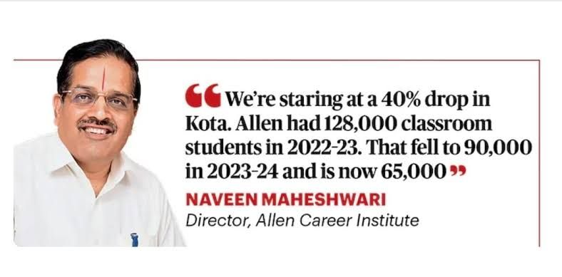 The online course sellers from physics wallah, e saral etc etc all rug pulled the whole industry, cost of year long course in kota was around 60-80k as far as I remember, and noe suddenly these guys were selling the whole thing for 10-15k, online scaled far rapidly that offline classes.