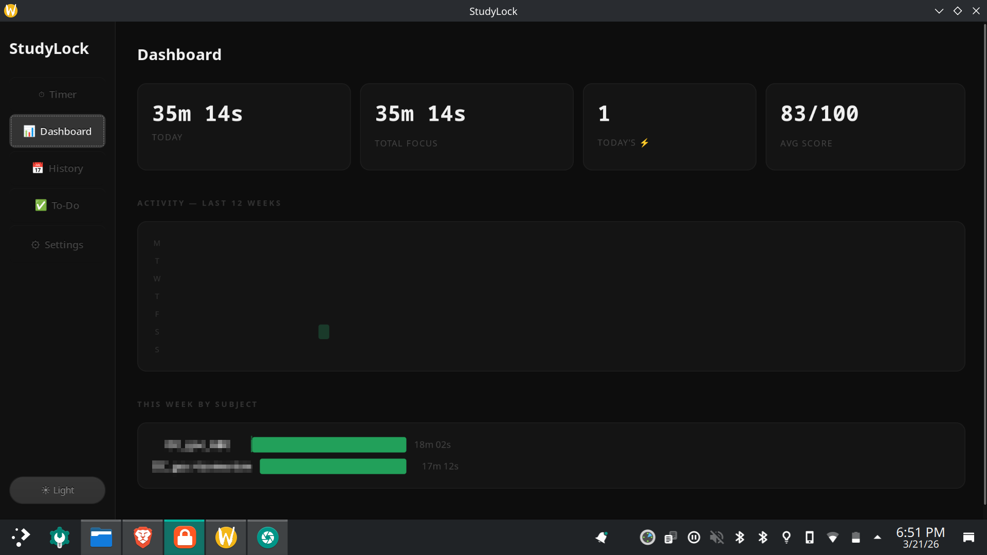 >Dashboard with heatmap, name of sessions with their time, then duration of today's focus, total focus from start