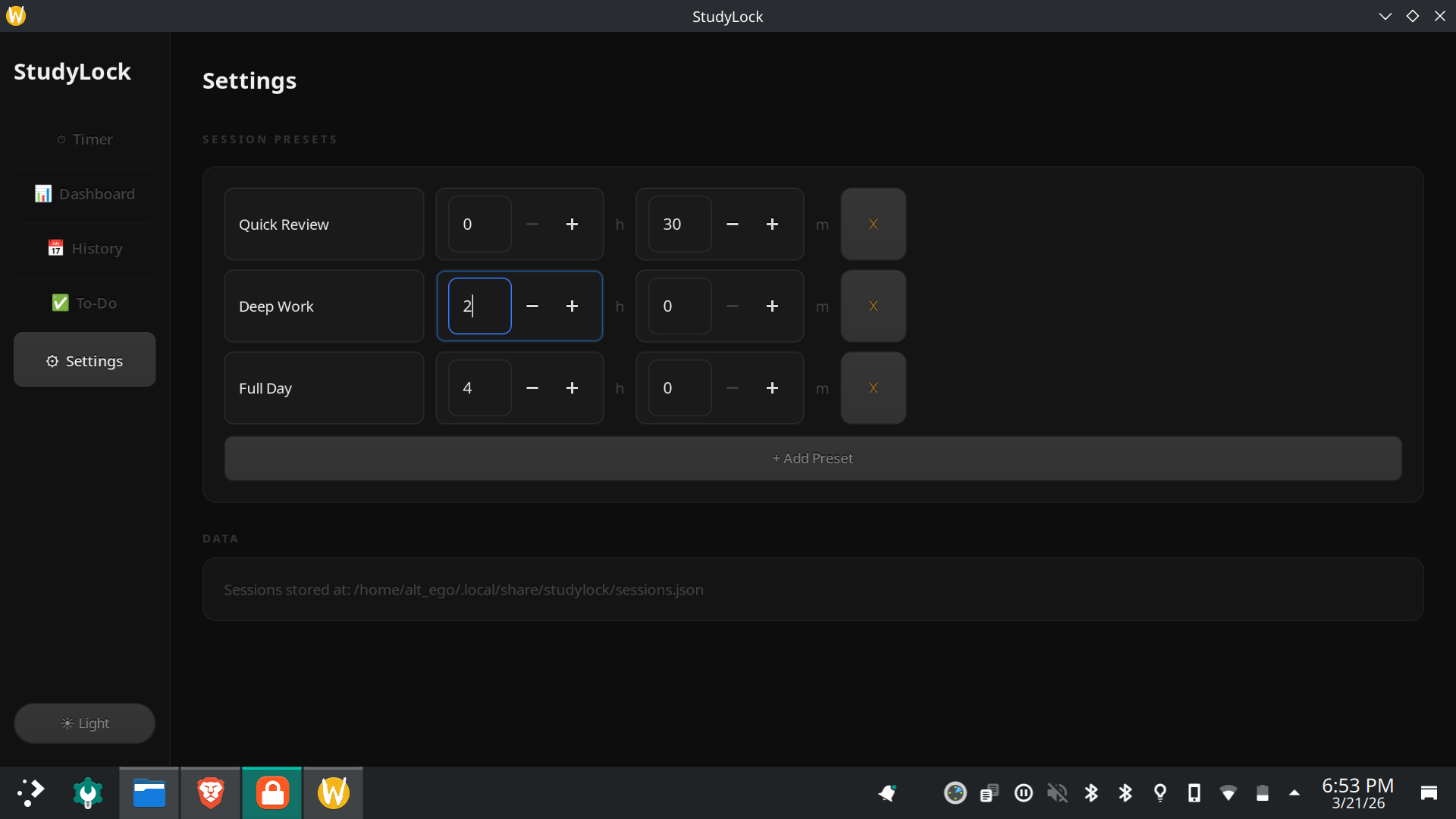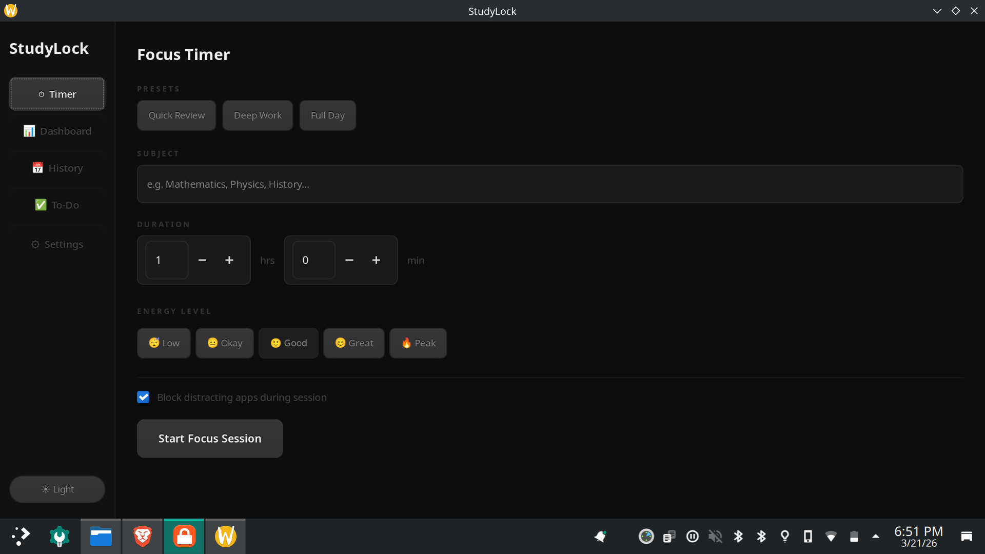 Then there is the main purpose,the timer section...add topic name,duration , energy level (preset) ,checkbox if you have to block everything or not(eg to watch yt lectures)