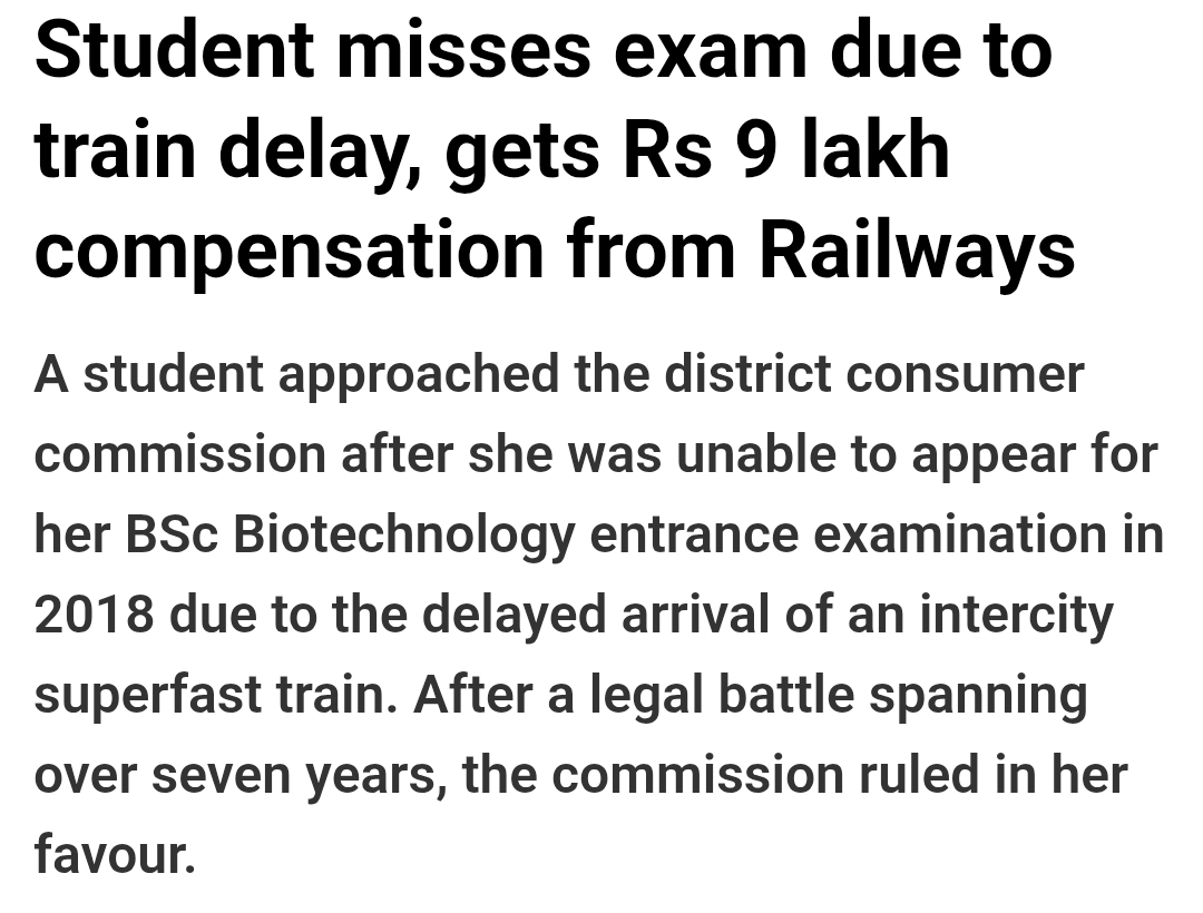 Students gets 9 lakh rupee as compensation after a long legal battle after missing out on an exam due to train delay.