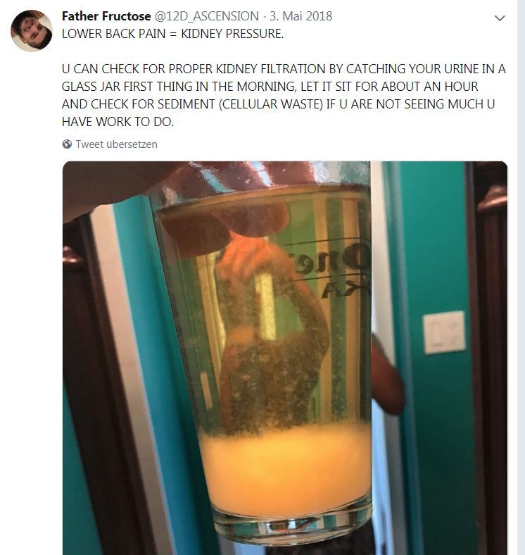 kidney filtration is what they say to describe the pee of someone. you see the glass of pee i have attached? this is from someone who does juice fasting in combination with naturopractical herbal tinctures (powerful liquid healing plant-concetrates that are drunk with water 3 times a day for several weeks) and herbal teas which taste awful at first.