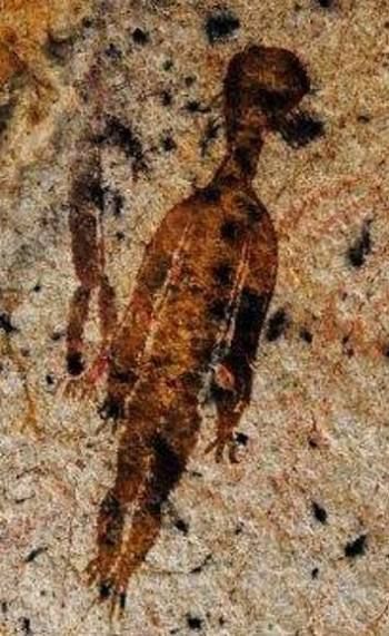 The paintings are located in caves near the town of Charama in Chhattisgarh, a state in central India. Most of the paintings are the usual drawings of humans, animals and everyday life in 8,000 BCE. But it also stunned many because some depict kangaroos and giraffes (not native to India at all) and fish-like-creatures. Now an archaeologist recently found new paintings of even stranger beings.