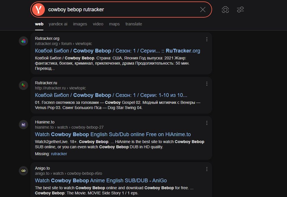 for example see picrel, i just searched cowboy bebop rutracker on yandex and it gave me the link