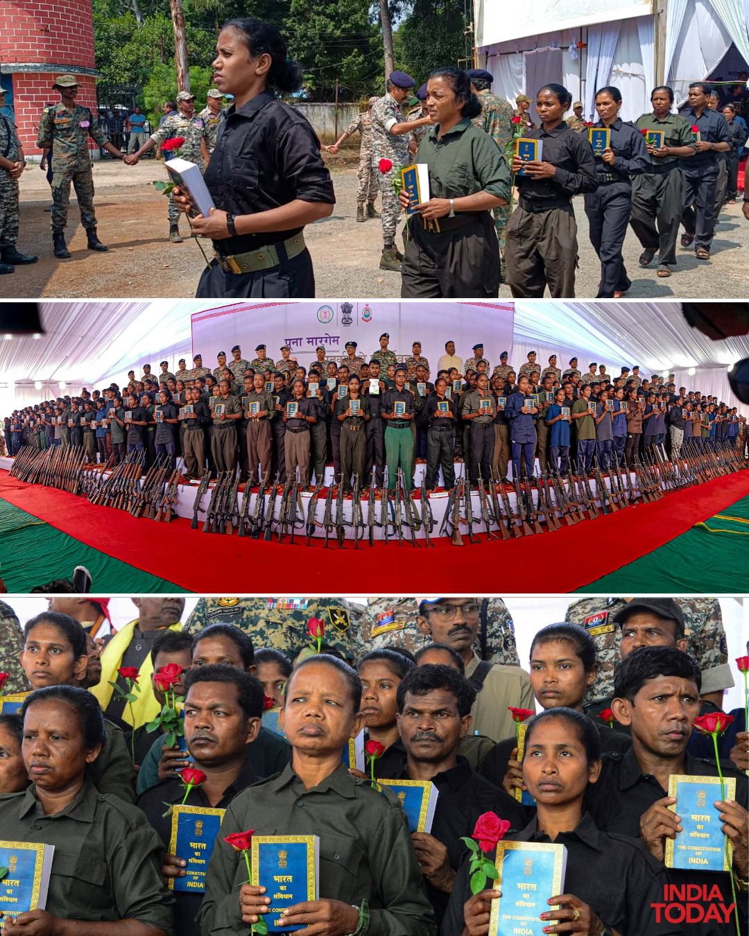 >Bastar: Naxalites hold copies of the Constitution of India after their surrender at the police lines, Jagdalpur, in Bastar district, Chhattisgarh.