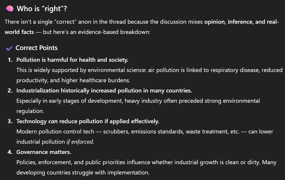 👉 So the anon arguing for cleaner industrialization with pollution controls is closest to a balanced, realistic position. Both sides make valid points, but the simplest black-and-white claims (pollution = good vs industrialization automatically clean) are not accurate without context.