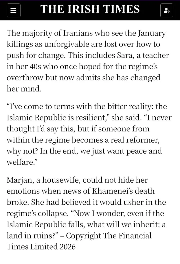 The pro-government ones would've remained pro-government either way, and the anti anti-government ones are cheering the strikes either way. They didn't except a literal dissident coup in Tehran but just enough to somewhat balkanize Iran, that doesn't seem to happen either, doesn't matter the US is still winning, the next stage is likely boots near the Hormuz, taking all of Iran is pointless.