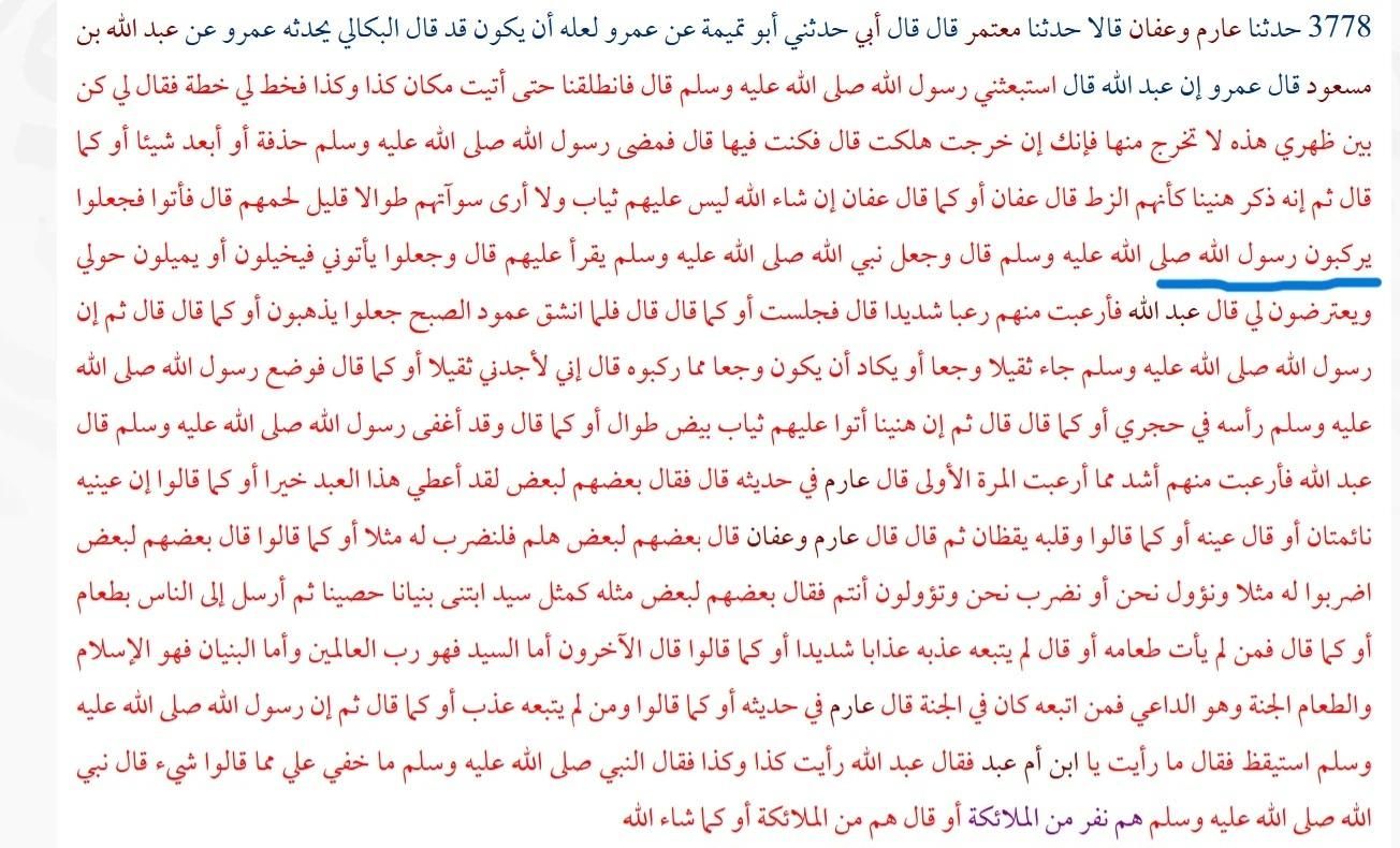 3778: It was narrated to us by 'Aarim and 'Affan who said: It was narrated to us by Mu'tamir who said: My father told me that Abu Tamimah narrated from 'Amr, who might have said that Al-Bakali narrated from 'Amr, from 'Abdullah bin Mas'ud. 'Amr said that 'Abdullah said: The Messenger of Allah (peace be upon him) sent me, and we set out until we reached a certain place. He drew a line for me and said, "Stay within this line, and do not leave it, for if you do, you will be destroyed." I stayed within it, and the Messenger of Allah (peace be upon him) went on a little distance or farther, or as he said. He then mentioned a group of beings, like the Zutt. 'Affan said or as he said: "They were not wearing clothes, and I could not see their private parts. They were tall and had little flesh." He said: "They came and started to ride the Messenger of Allah (peace be upon him), and the Prophet of Allah (peace be upon him) started to recite to them. They came to me, and they appeared to sway around me and hinder me." 'Abdullah said: "I was very terrified of them. I sat down or as he said. When the dawn column split, they began to leave or as he said. Then the Messenger of Allah (peace be upon him) came back heavily and in pain or almost in pain from what they had ridden him. He said: 'I feel heavy or as he said.'" The Messenger of Allah (peace be upon him) laid his head in my lap or as he said. Then a group of them came wearing white long garments or as he said. The Messenger of Allah (peace be upon him) fell asleep. 'Abdullah said: "I was more terrified of them than I was the first time." 'Aarim said in his narration: "Some of them said to each other: This servant has been given goodness, or as they said, his eyes are asleep or he said one eye or as they said and his heart is awake." 'Aarim and 'Affan said that some of them said to each other: "Come, let us give him a parable or as they said." They said to each other: "Give him a parable, and we will interpret it or we give it, and you interpret it." Some of them said to each other: "His example is like a master who built a strong building and then sent people with food or as he said. Whoever did not come to his food or did not follow him, he punished them severely or as they said." Others said: "The master is the Lord of the worlds, the building is Islam, the food is Paradise, and the caller is the Prophet. Whoever followed him was in Paradise." 'Aarim said in his narration: "Or as they said, whoever did not follow him was punished or as they said." Then the Messenger of Allah (peace be upon him) said: "What did you see, O son of Umm 'Abd?" 'Abdullah said: "I saw such and such." The Prophet (peace be upon him) said: "Nothing of what they said was hidden from me." The Prophet of Allah (peace be upon him) said: "They were a group of angels or as he said, they were angels or as Allah willed."