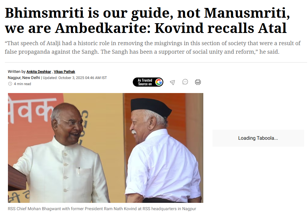 Example for today, a ragebait headline by media which was misrepresenting Ex President statement who is quoting ABV regarding the sangh reproachment with dalit and non-dwijas over the rumor mongering by congress.