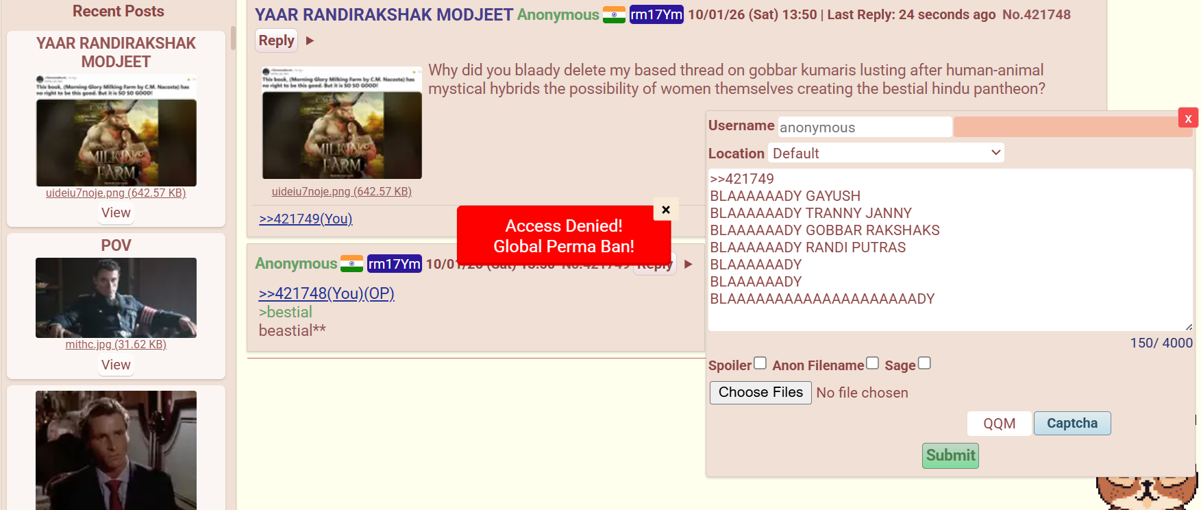 This place has fallen. Mods are literal gobbar worshippers and are praud randi rakshaks. They'd much rather ban an outspoken gobbar hater rather than doing something about that self fagging troon larping as femanon.